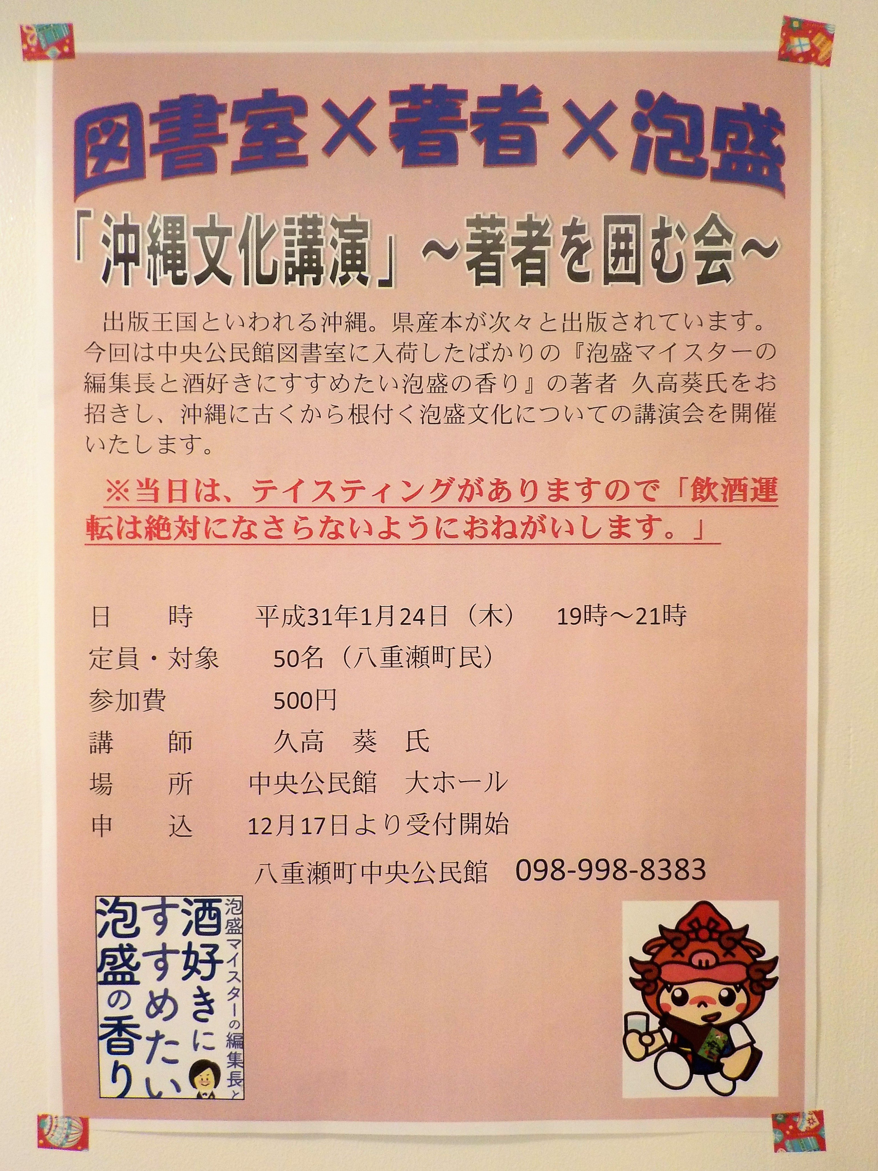 【八重瀬町内イベントのご紹介】1/24(木)19時~八重瀬町立中央公民館にて、沖縄県産本「泡盛マイスターの編集長と酒好き... [Twitter]