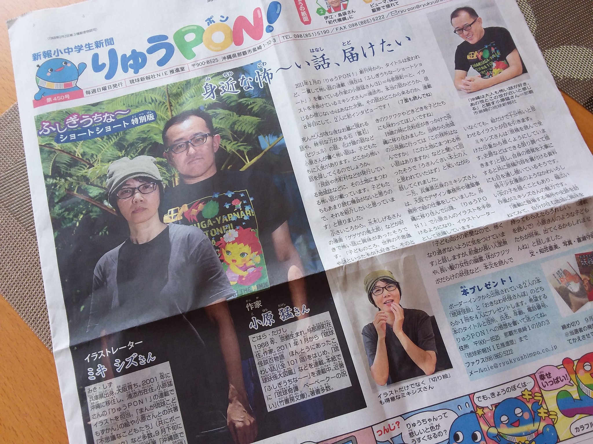 こんにちは~台風発生にハラハラしている月曜日くじらブックス営業中!昨日付の琉球新報こども新聞りゅうPON!に、琉球怪談作家・小原猛さん、イラストレーター・ミキシズさんが登場しています。いつもにこやかなお二人がビシッと決めた表情、カッコイイ!皆さまぜひご覧下さい※明日9/3は店休日です※ pic.twitter.com/Ej8VhZocPO