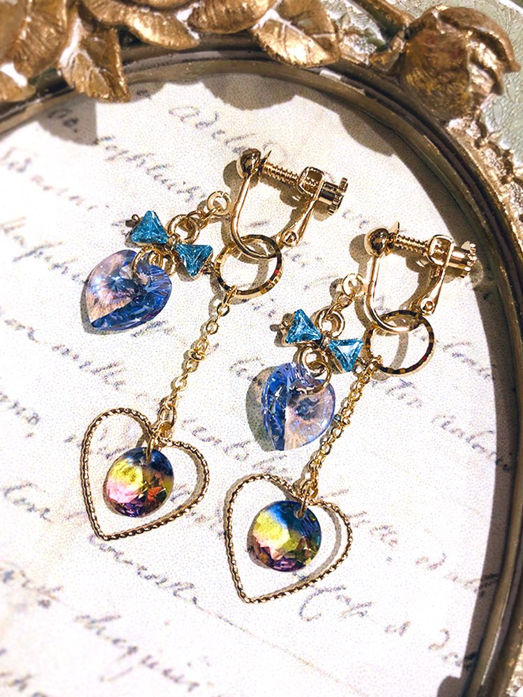 背景によってピンクや水色、青色っぽく見えたりと様々な表情を見せるクリスタルハートの魅惑的なイヤリングです✨
