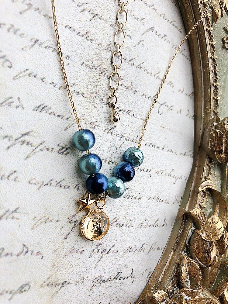 コットンパールは1粒に青と紺の2色の表情があります。チェーンは細く華奢な印象です✨