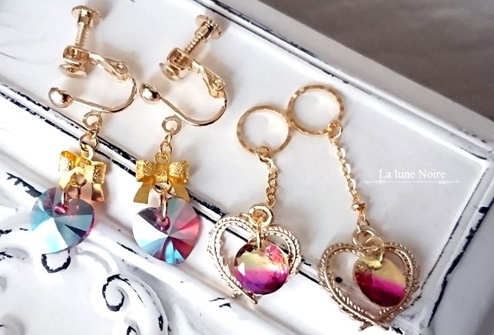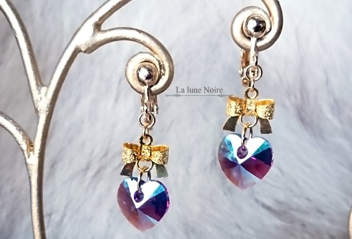 背景によって紫色や深緑色に見えたりと様々な表情を見せるクリスタルハートの魅惑的なイヤリングです✨