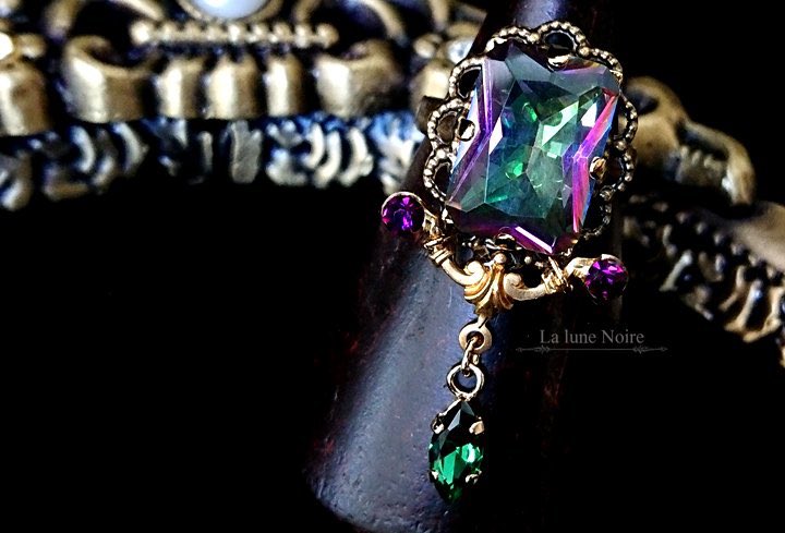 大粒のエメラルドガラスが印象的なリング💎✨見る角度により紫色にも輝く不思議な色合いです💍✨