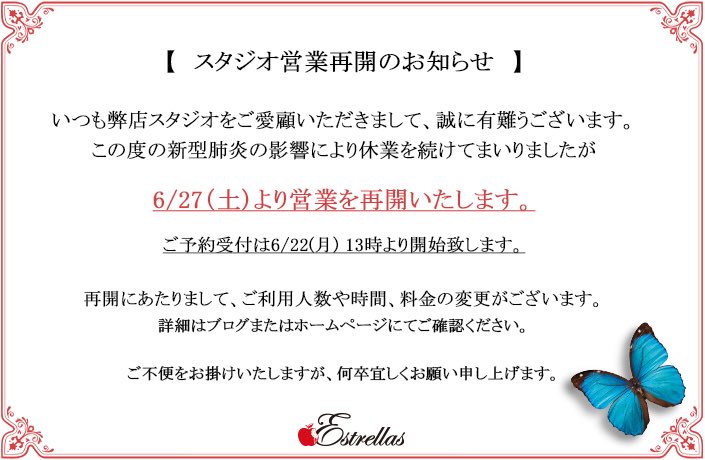 【 エストレージャス2Fスタジオ再開のお知らせ 】🌟6/27(土)よりスタジオの営業を再開致します。🌟ご予約受付は6... [Twitter]