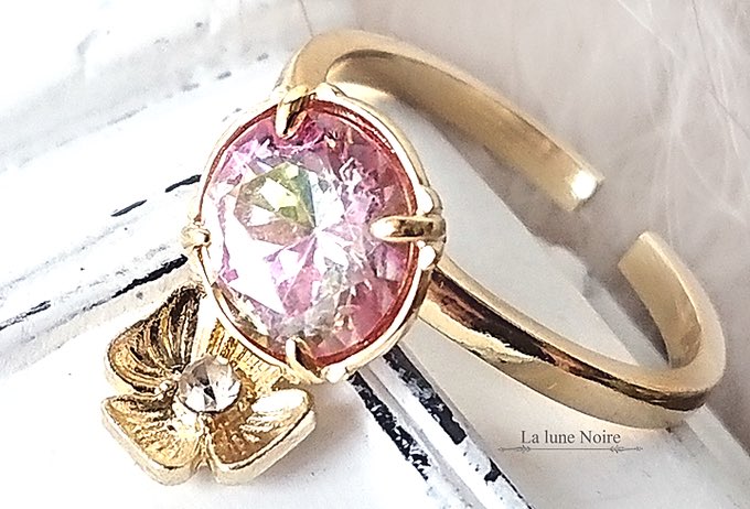 ピンクのストーンにグリーンのシラーが入った、上品で優しい印象のアイテム。