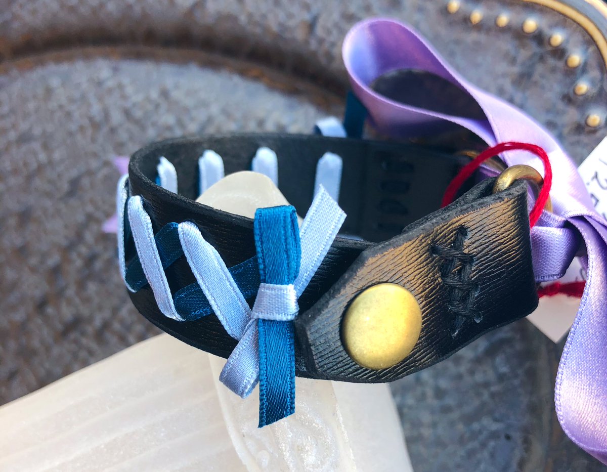 #不思議の国のアリス をイメージしたファンシーかつパンキッシュなアイテム。本革と国産リボンを使用しています。