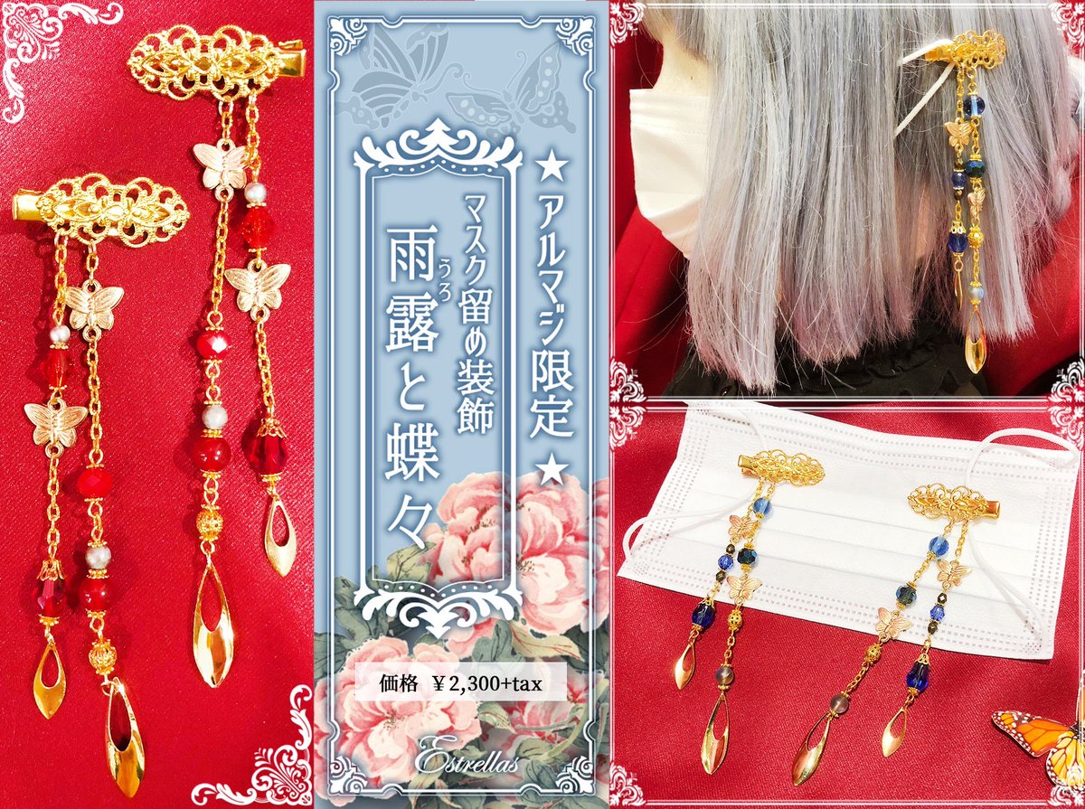 🦋アルマジ様限定アイテム🦋#マスク留め装飾【 新作 】✨雨露(うろ)と蝶々✨ ¥2,300+税煌びやかなガラスビーズ... [Twitter]