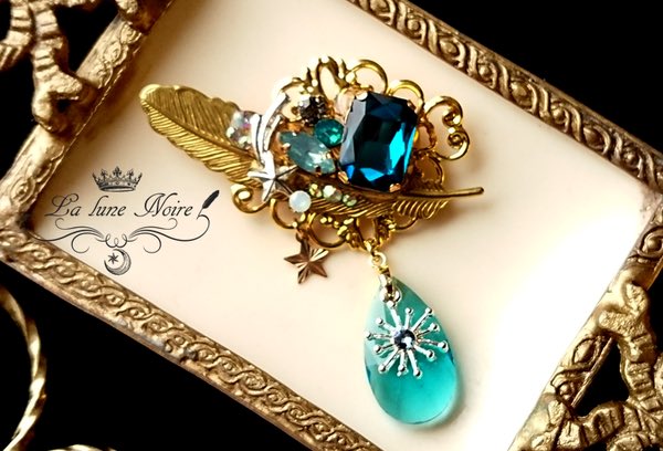 @une_lune_noir 【 羽根飾りブローチ/水色 】¥3,300-(tax in) 大粒のストーンや金色の羽根や手、星のモチーフが装飾された美しいブローチ。 垂れ下がるドロップビジューも透き通っていて軽やかな印象です。 ◇ 通販はこちらより ◇ estrellas1025.shop-pro.jp/?pid=129527647 pic.twitter.com/61T1tttpHF
