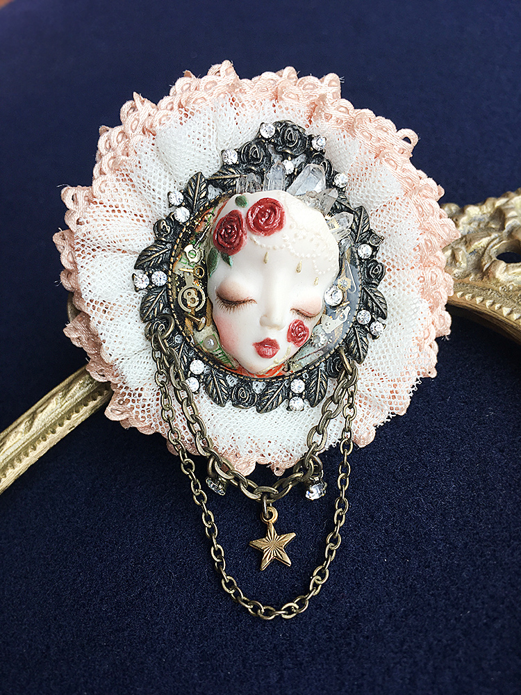 ・ 薔薇姫のブローチ ¥9,500-(税込) 穏やかに目を閉じた少女が印象的なビスクドールのブローチ。ドール作家 Silver Star~銀星堂~による手作りの装身具です。 estrellas1025.shop-pro.jp/?pid=115659099