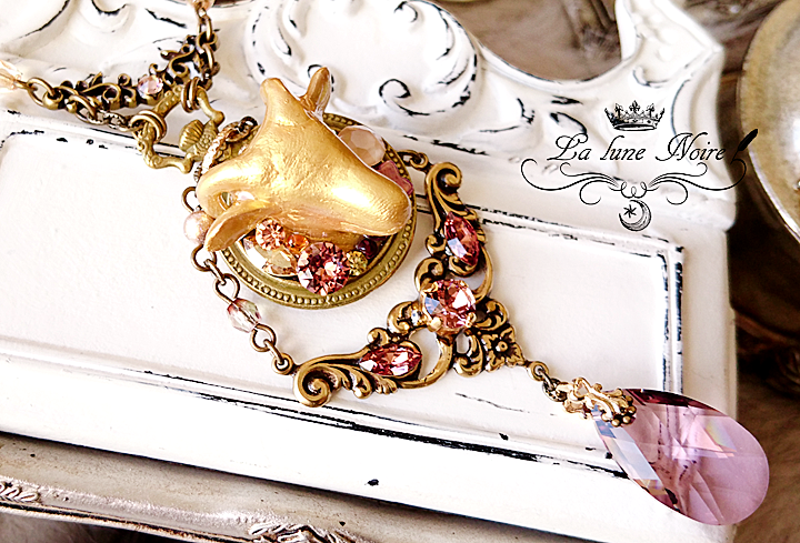 山羊のゴシックネックレス/Victoria Gardens ¥7,200-(税込) ゴシックテイストの山羊をメインに華やかな花々やビジューを散りばめたネックレス。豪奢なデザインが目を惹きます。春先にもお勧めのアイテム