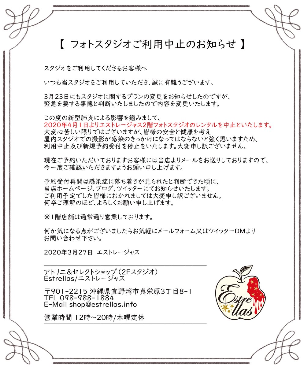 エストレージャス2階スタジオ レンタル中止のお知らせです。これからご利用予定でした方、すでにご予約されていた方、大変申し... [Twitter]