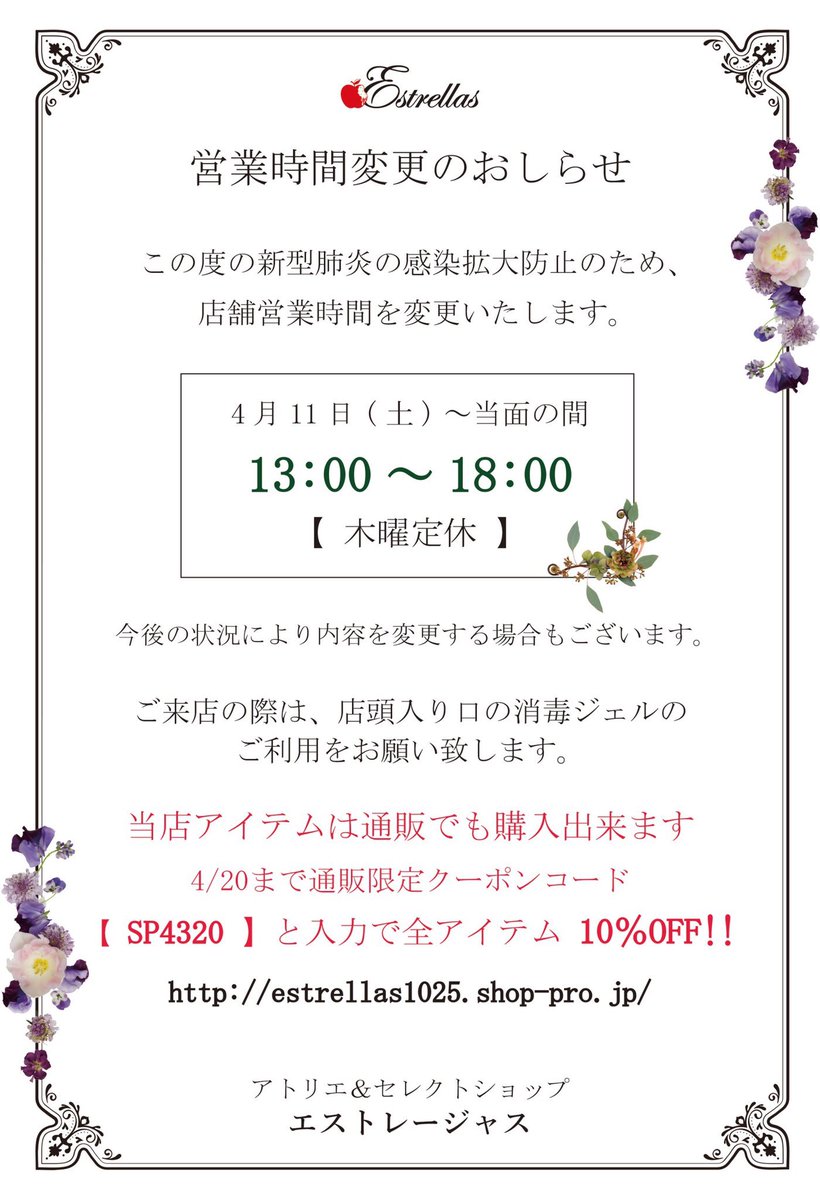 🍎こんにちは、アトリエセレクトショップ エストレージャスです。本日も18時迄の営業です。🍎通販にてスペシャルクーポン... [Twitter]