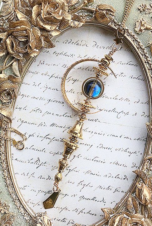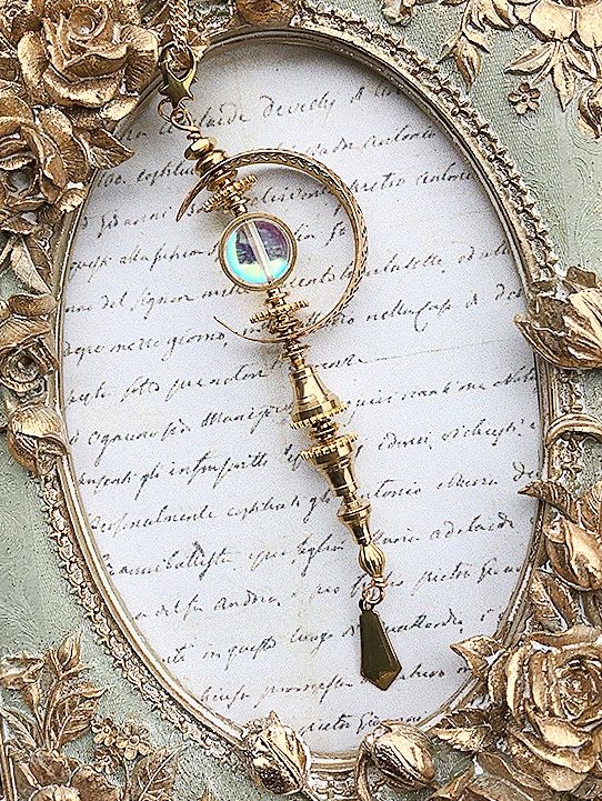 真鍮の輝きと不思議な色合いの硝子ビーズが印象的なネックレス。神秘的な杖のシルエットも美しく、まるで魔法使いの道具のようなアイテム🔯✨