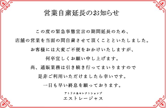 この度の緊急事態宣言の期間延長を受けまして、5/8以降も当面の間、店舗の営業を自粛させて頂く事と致しました。