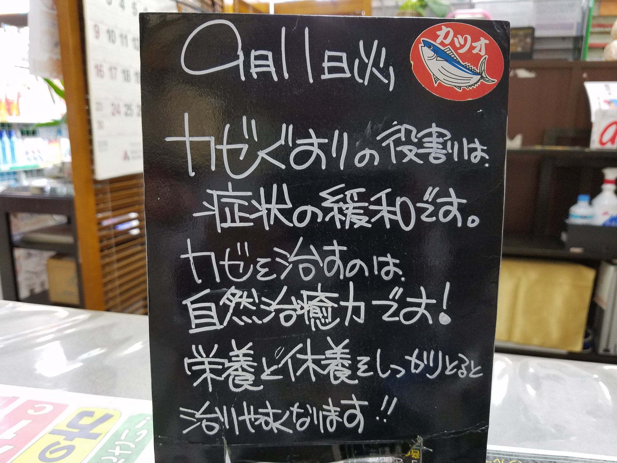 風邪薬では風邪は治りません! あくまで熱、頭痛、セキ…風邪の諸症状の緩和し体の負担を軽くする役割です。栄養と休養を十分に... [Twitter]