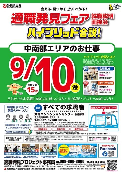 | お問い合わせ | TEL:098-860-8900 ご参加の際はHPまたはお電話にて事前にお申し込みください。 適職発見プロジェクトHP:https://jobmatching.info |