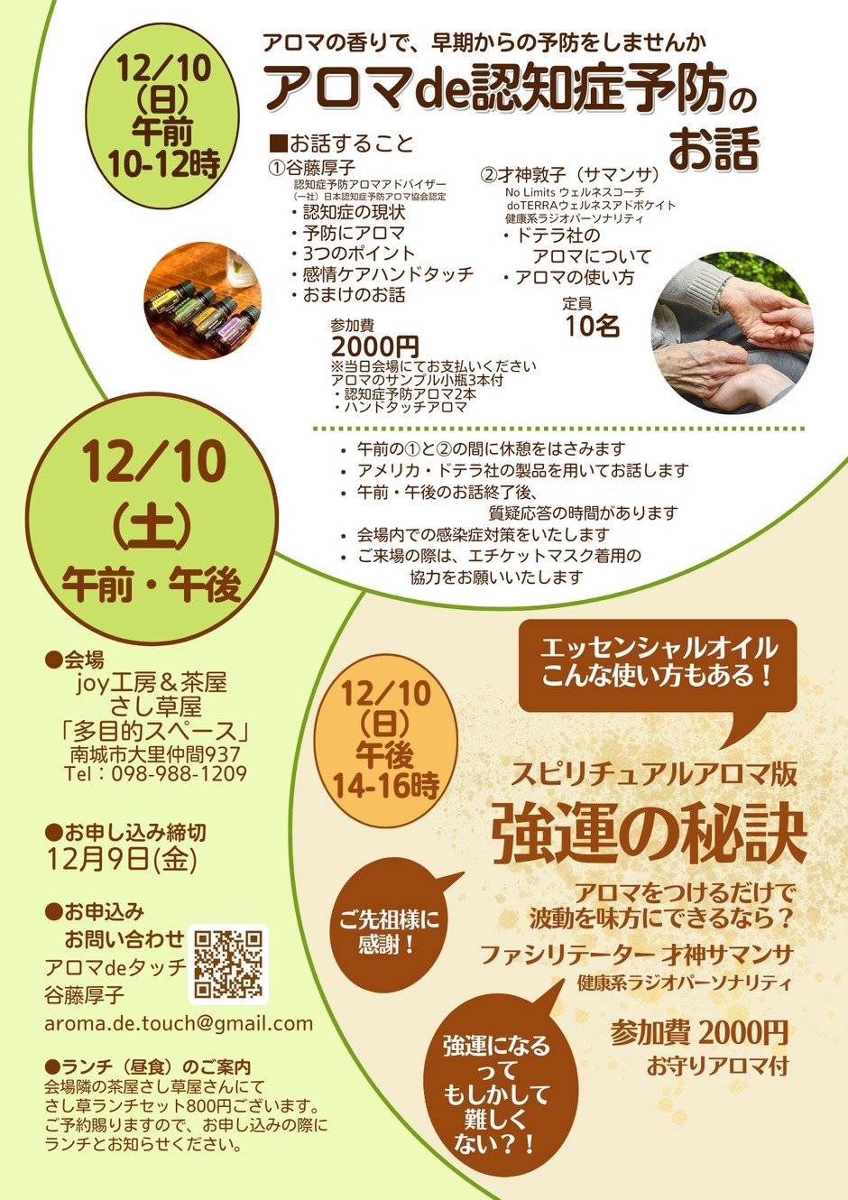 | お問い合わせ | 主催 アロマ de タッチ 担当:谷藤厚子 連絡先メール : aroma.de.touch@gmail.com |