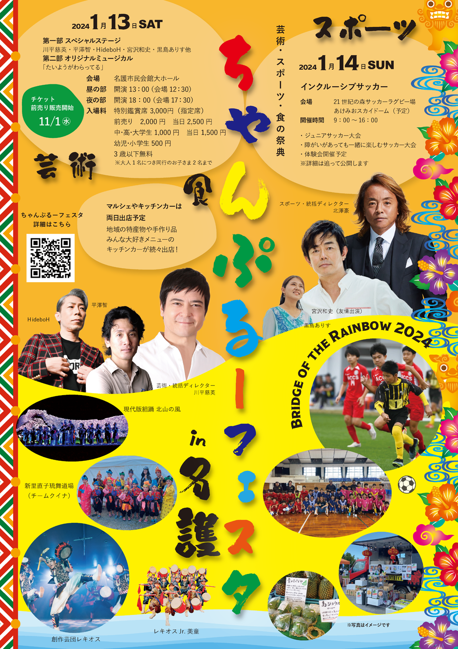 沖縄県名護市発!「芸術・スポーツ・食」3つの柱をテーマに、性別や年齢、障がいの有無・環境に関係なく、みんな一緒に「ちゃんぷるー」で楽しむためのイベントです。